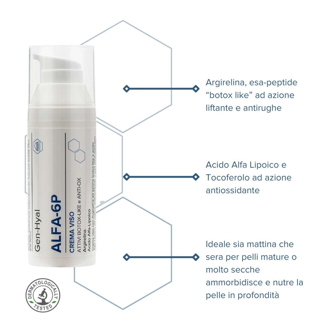 Gen-Hyal ALFA-6P è una crema viso studiata per soddisfare le esigenze di pelli mature o molto secche che presentano segni di invecchiamento cutaneo e mancanza di elasticità.