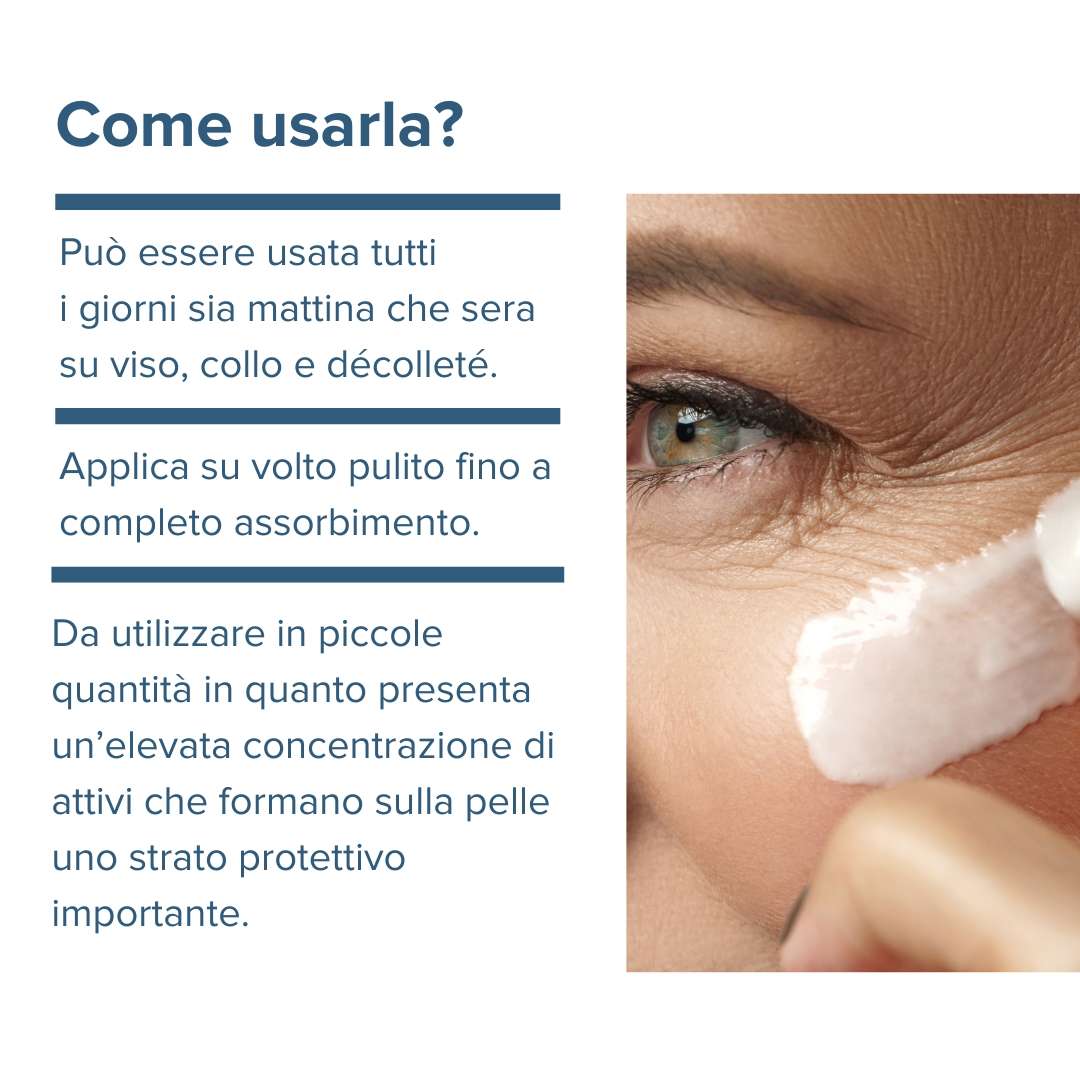 Questa crema viso è indicata per pelli mature, molto secche o che presentano segni di irritazione e arrossamenti. Caratterizzata da una texture soffice ma ricca, il suo scopo è ammorbidire e rendere la pelle di viso, collo e décolleté più elastica e compatta, dando modo all’esapeptide di svolgere al contempo un’azione anti-age importante. È consigliato l’uso al termine della routine cosmetica come ultimo step quotidiano perché è un prodotto corposo e ricco che dona alla pelle un tocco finale di morbidezza ed elasticità.