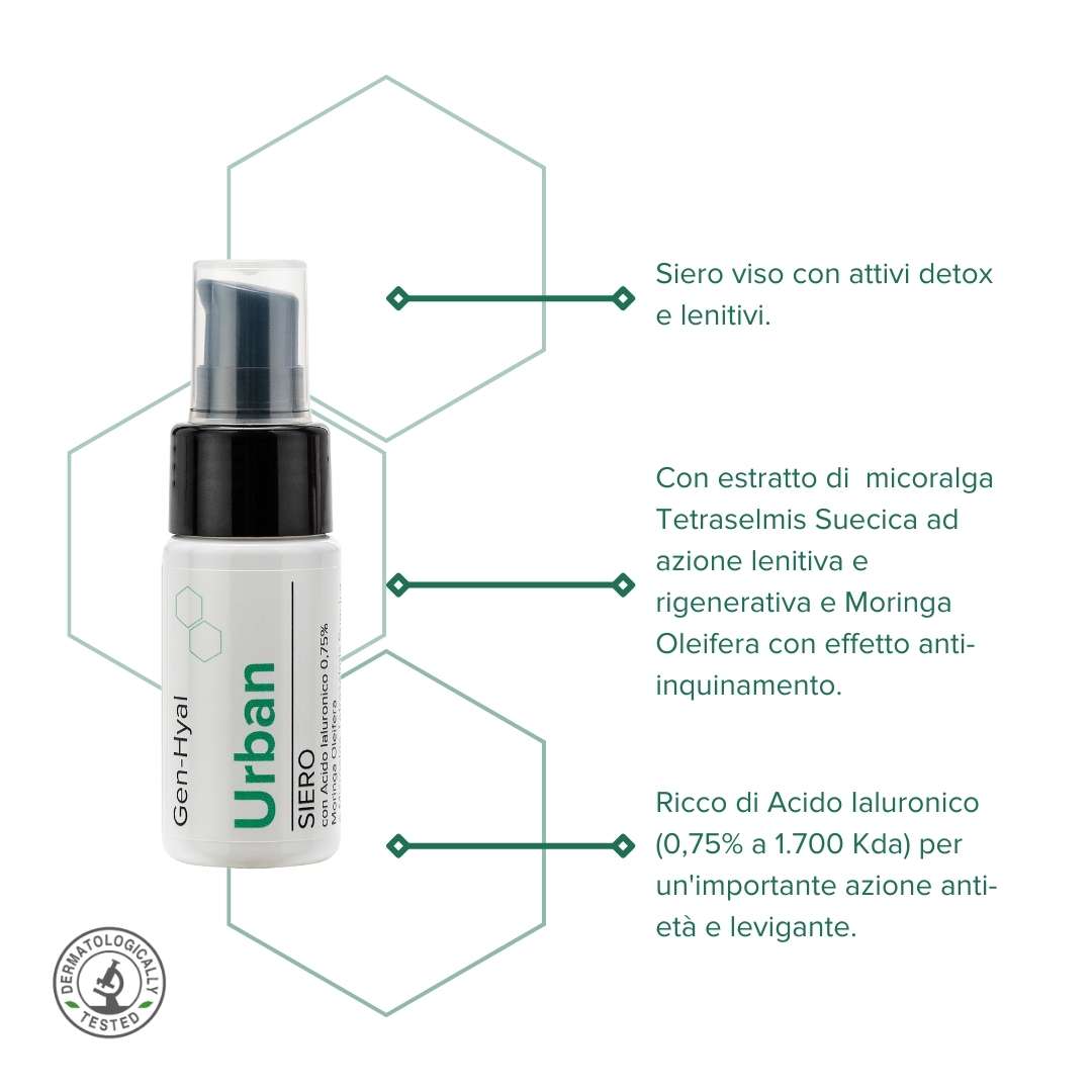 Ricco di Acido Ialuronico (0,75% a 1.700 Kda) per un’importante azione anti-età e idratante, il siero URBAN è composto da emulsionanti di origine vegetale come lecitina e glicerolo, che stabilizzano la formula senza appesantirla.