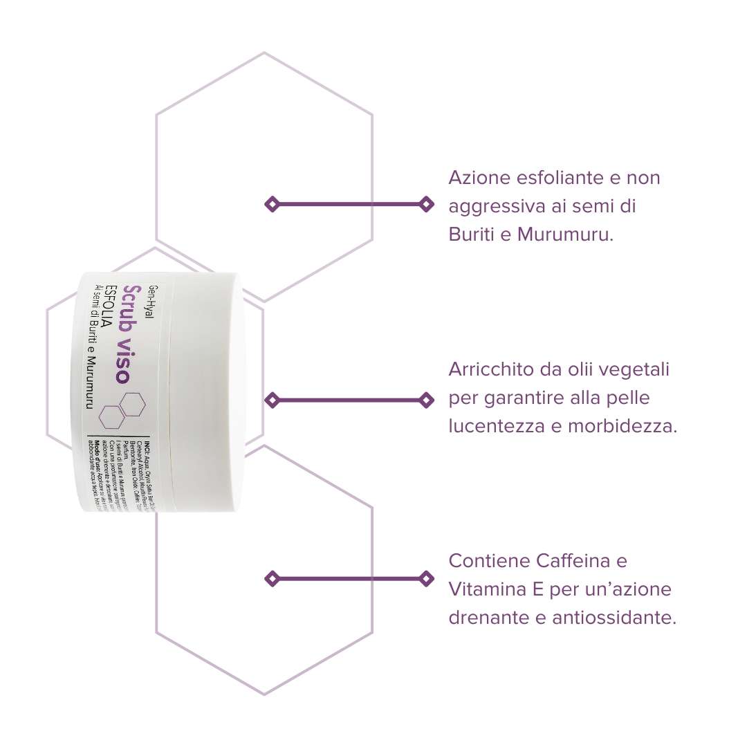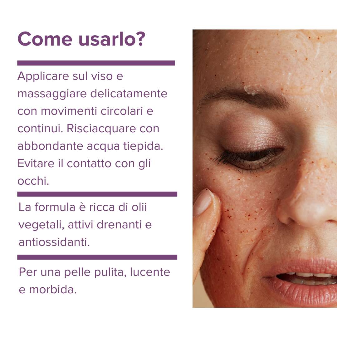 La formula dello scrub viso è arricchita da olii vegetali per garantire alla pelle lucentezza e morbidezza, oltre a Caffeina e Vitamina E per un’azione drenante e antiossidante.